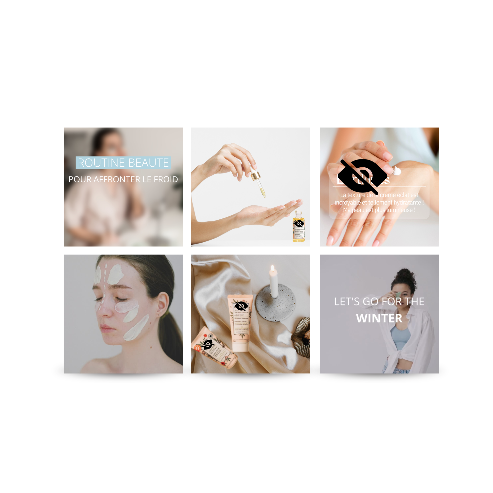 J’ai pu réaliser un prototype de feed Instagram pour un groupe de cosmétiques et de parfums. Le feed devait être harmonieux et présenter ses produits pour la période hivernale.